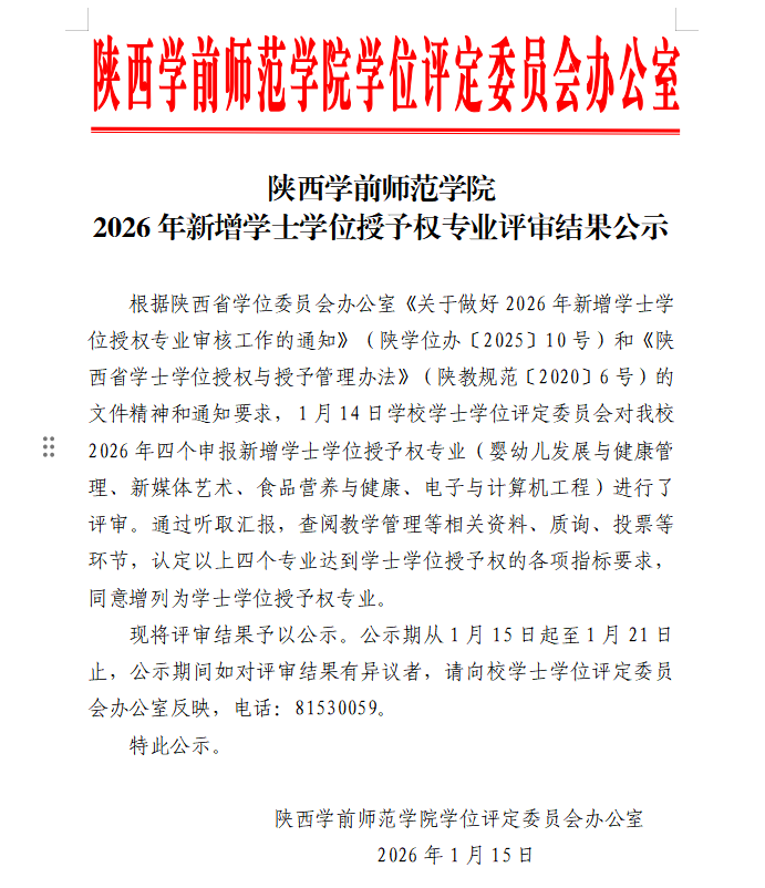 陕西学前师范学院2026年新增学士学位授予权专业评审结果公示